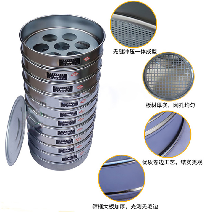 φ200mm (10只/套+底蓋)0.075、0.25、0.5、1.0、2.0、5、10、20、40、60mm標準篩框材質:由不銹鋼板、黃銅板、冷軋鐵皮(鍍鉻或鋅),塑料等材料構成。采用一次沖壓成型,篩框平整、光潔度高、套篩組裝互換。